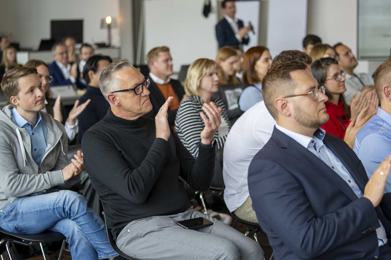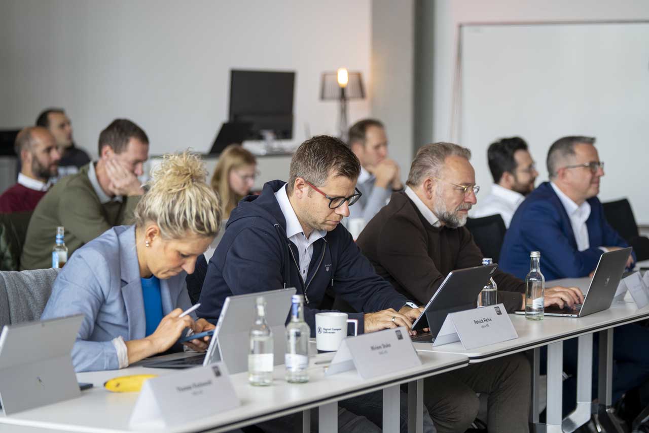 Am Abschlusstag findet der finale Pitch statt, an dem du dein Digitalisierungsprojekt vor einer Jury und den anderen Teilnehmer:innen vorstellst. Die Jury besteht aus dem wissenschaftlichen Leiter des Programms, sowie Vertretern der teilnehmenden Unternehmen. Mit dem erfolgreichen Abschluss des Programms erhältst du dein Abschlusszertifikat der RWTH Aachen University.